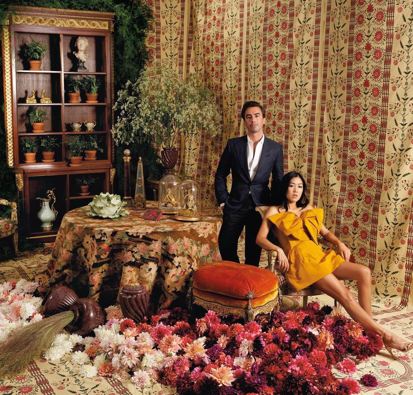 Oscar de la Renta co-creative directors Laura Kim and Fernando Garcia photographed for Christie’s, in promotion for the private collection of Jayne Wrightsman (2020).